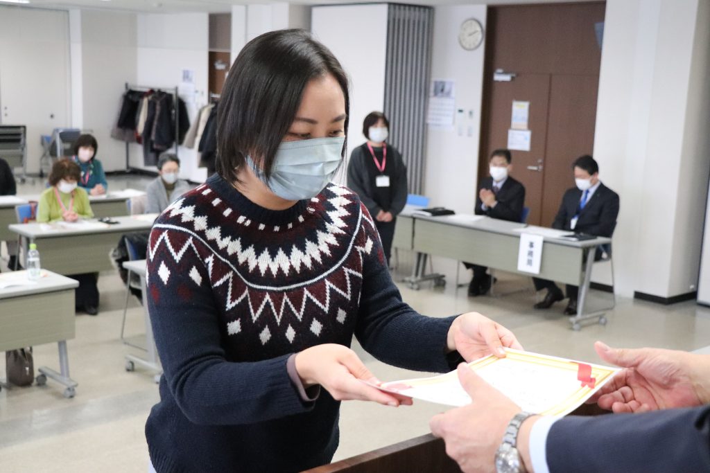 テーブルマナー講座のあとは、ふらの農協本所に移動し、卒業式が行われました。植﨑学長から卒業証書が授与されたほか、女性大学の2年間、10講座をすべて受講された7名には皆勤賞が贈られ、他の学生からは称賛の声が聞かれました。