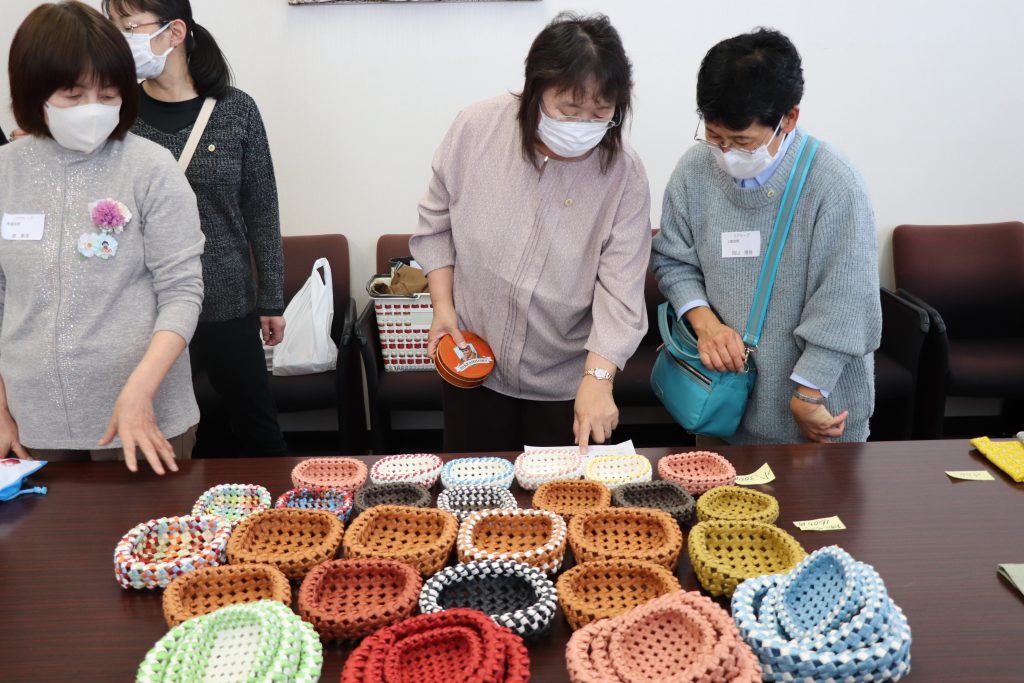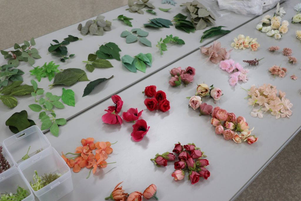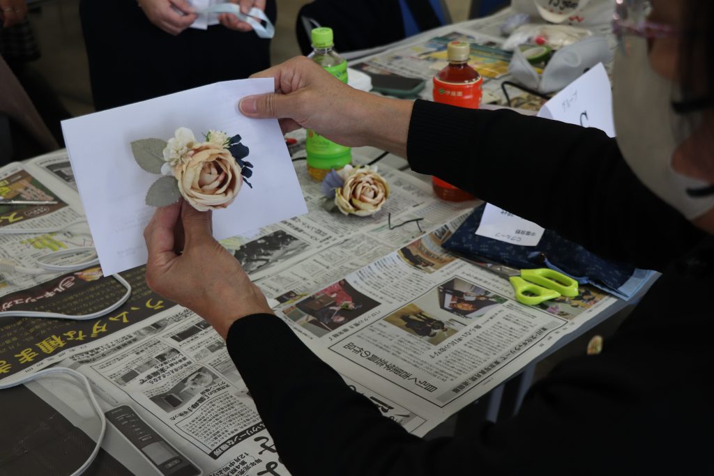 今回の全体事業は、5グループに分かれ役員が講師となりコサージュ作りを行いました。100円ショップで集めた材料はカラフルかつたくさんあり、好みの材料選びからわいわい楽しみました。大小さまざまな花材や、パール、レースなどの飾りをどこに配置しようかなと悩みながら個性あふれるコサージュが完成しました。