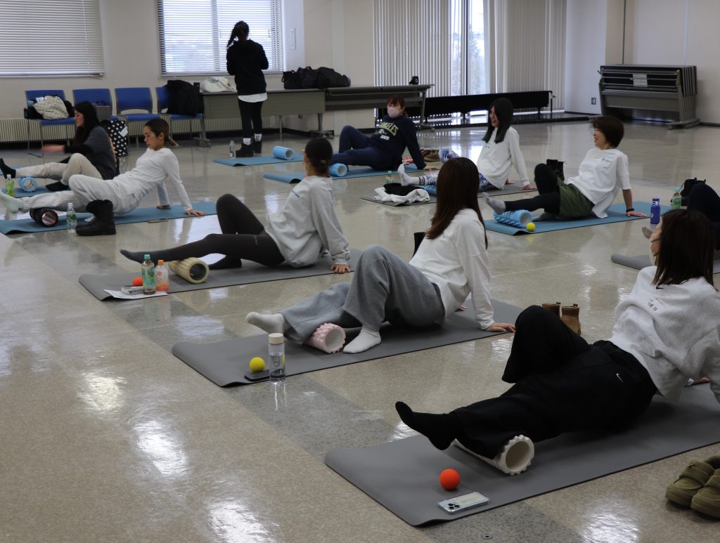前半は「美筋ヨガでボディメイク&身体への不調へアプローチ」と題して、Run2-yoga(るんるんヨガ)の山本薫氏を講師にお招きし、農作業や家事や子育てにと凝り固まった身体のメンテナンスを行いました。『ほぐす→伸ばす→鍛える』の順に教わり、始めは身体に当てると痛かったローラーも徐々に気持ちよくなり、肩の可動域も広がるなど効果を実感した講座となりました。