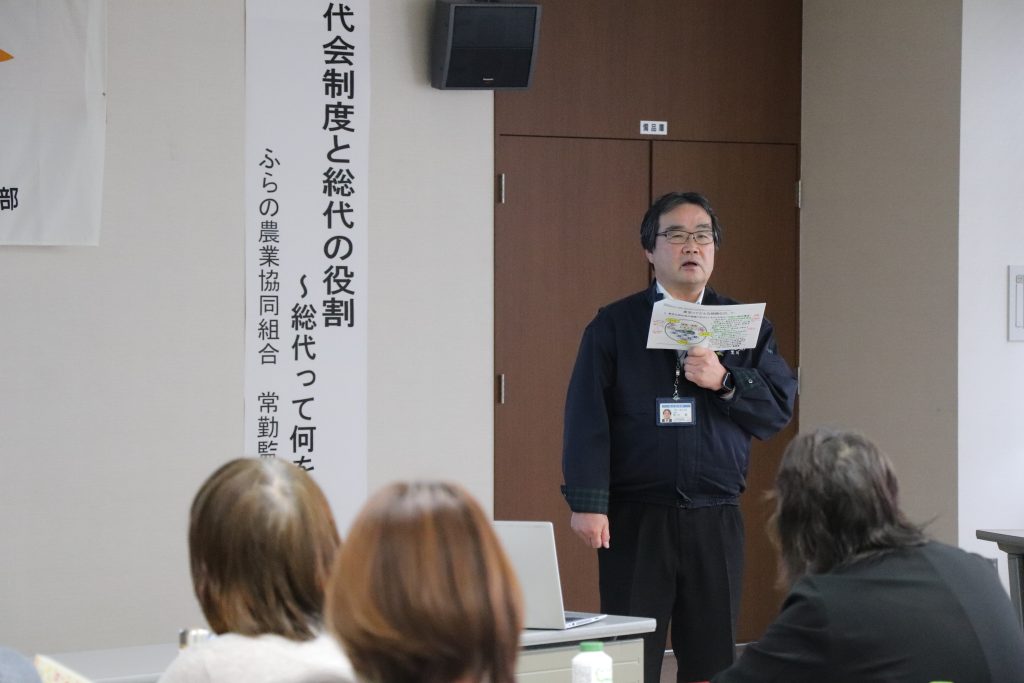 12月10日本所にて3者合同事業として、JA組織の成り立ちや運営方法、総代会制度と総代の役割について、荒川常勤監事に講義いただきました。