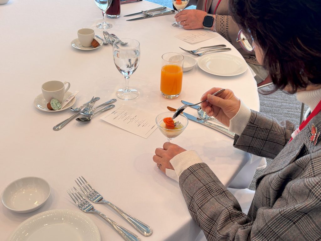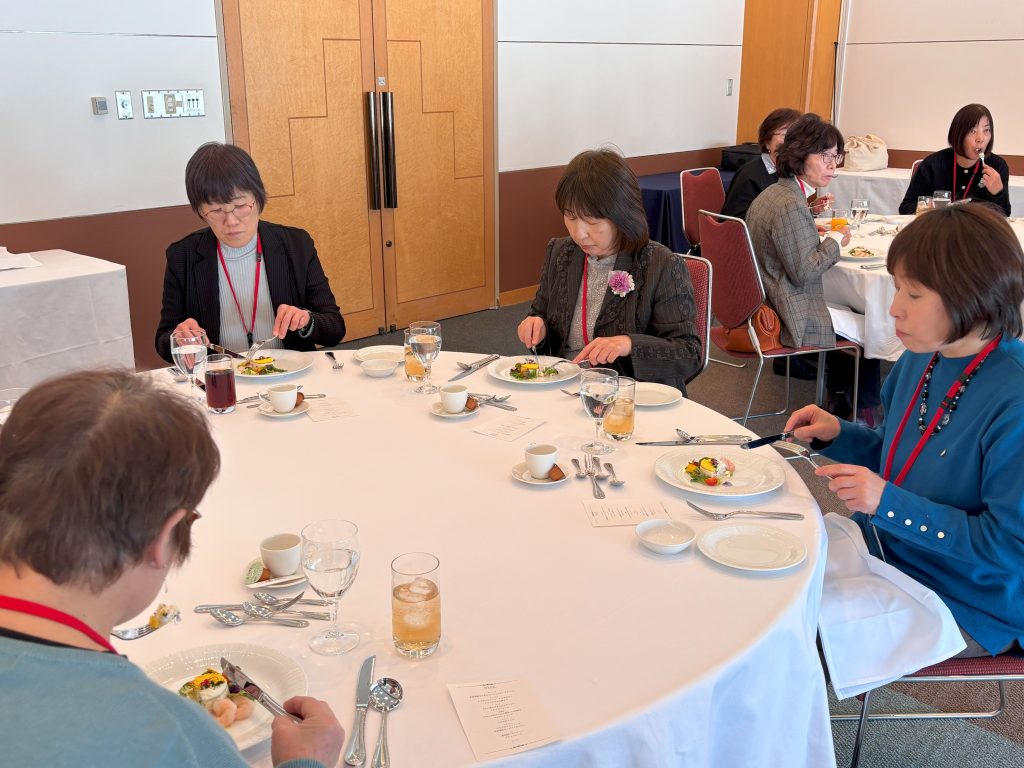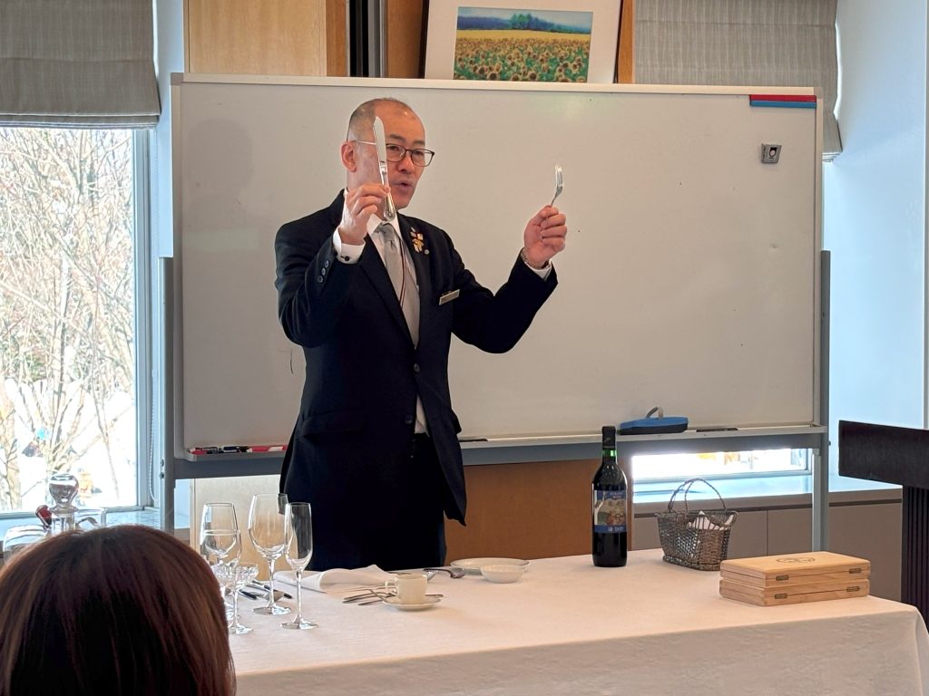 新富良野プリンスホテルで行ったテーブルマナー講座では、高松ソムリエより着席やナプキンの置き方のお話、フォークやナイフの使い方、グラスの持ち方などの作法を学びました。何より同席する方と楽しく、美味しく食事することができると概ねマナーは守られていると伺い、和やかに歓談しながら食事を楽しみました。料理ではシェフやパティシエより材料の産地や調理方法なども丁寧に説明をいただき、地域食材を活かした料理が目にも鮮やかに彩られ、皆さんの舌を唸らせました。